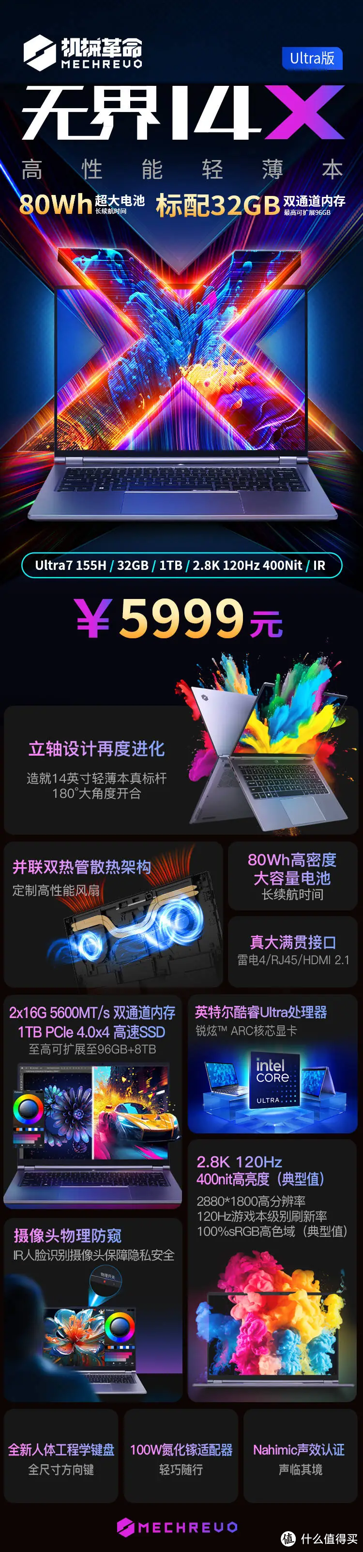 此外,这款笔记本在模具设计上也进行了全面升级,采用了14英寸的新模具设计,支持 180° 开合,为用户提供了更大的使用灵活性。同时,它还配备了双风扇双热管散热系统、80Wh 大容量电池以及 100W 氮化镓适配器,确保在高性能运行的同时,也能保持稳定的散热效果和持久的续航能力。