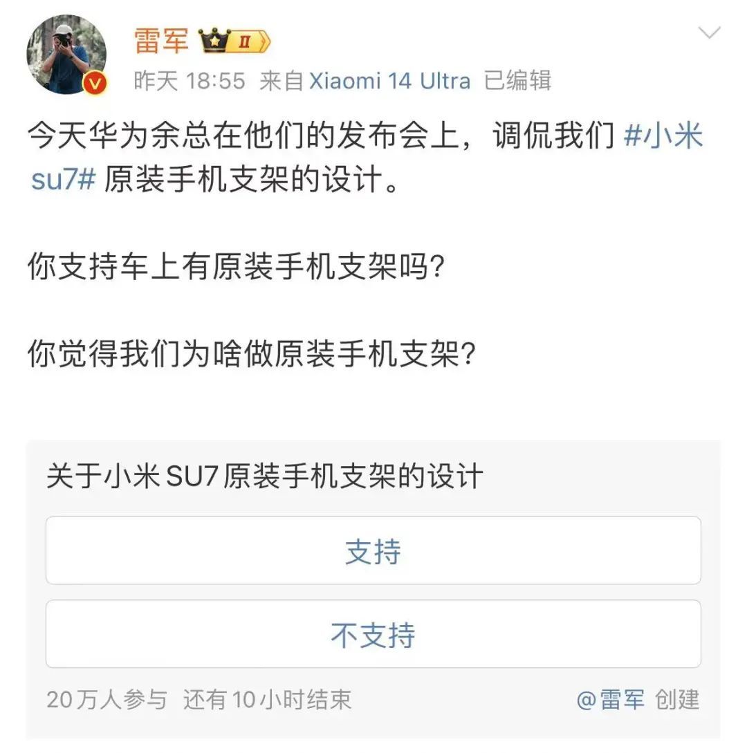 当晚,雷军更是亲自发微博回应,“没事。同行之间互相交流一下,有助于提升产品水平”,并再次借题发挥,向网友提问是否支持车上有原装手机支架。