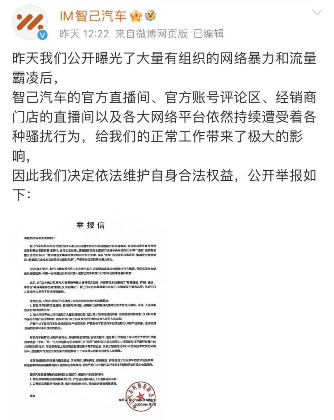被网友逼急的智己,终于无奈发布一封“举报信”, 并表示“这些网暴行为严重干扰了智己汽车经销商的生产经营活动,影响了智己汽车及智己品牌、智己L6的产品形象。造成极其恶劣的影响和不可挽回的损失。”
