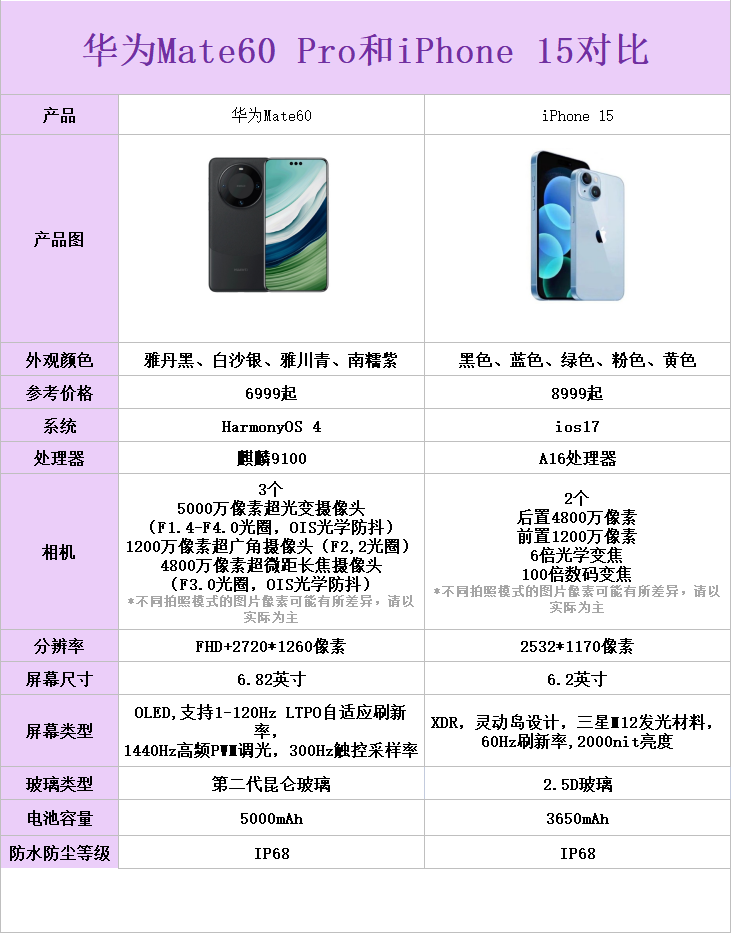 所以今天小编就来为大家整理了它们的区别,希望对大家的选择起到作用。以下是华为Mate60 Pro和iPhone 15的具体对比参数: