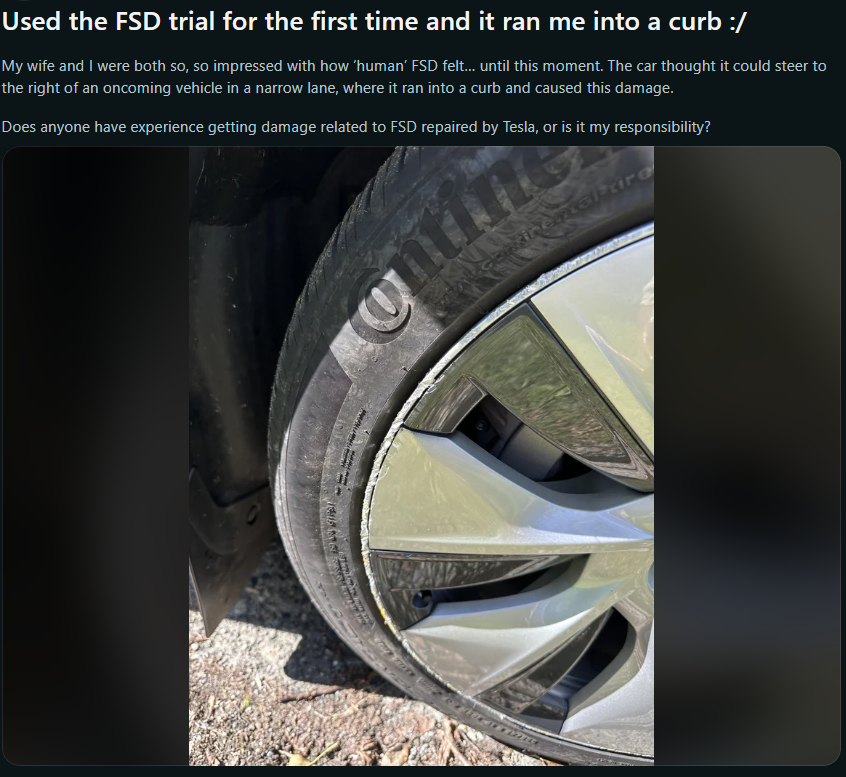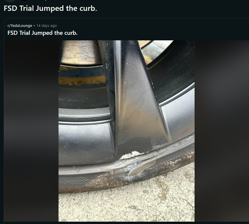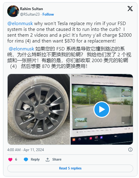 还有用户在 X 平台上发布帖子艾特 @特斯拉 CEO 埃隆・马斯克,并附上了一段视频,视频中汽车与路缘石发生碰撞,导致车轮受损。帖文中提到更换一个车轮的费用为 870 美元,并且即便有视频证据证明事故发生在开启 FSD 的情况下,特斯拉也拒绝对其进行赔偿。