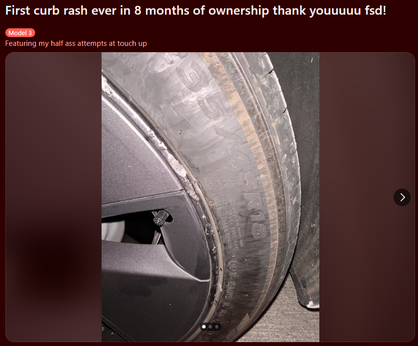 具体来说,很多特斯拉汽车在使用 FSD 后发生了轮胎剐蹭马路牙子的问题。在过去几周里,许多用户在社交平台 Reddit、X 和 YouTube 上反映,使用 FSD 的特斯拉汽车在转弯时因离路缘石太近而导致轮毂和轮胎损坏。