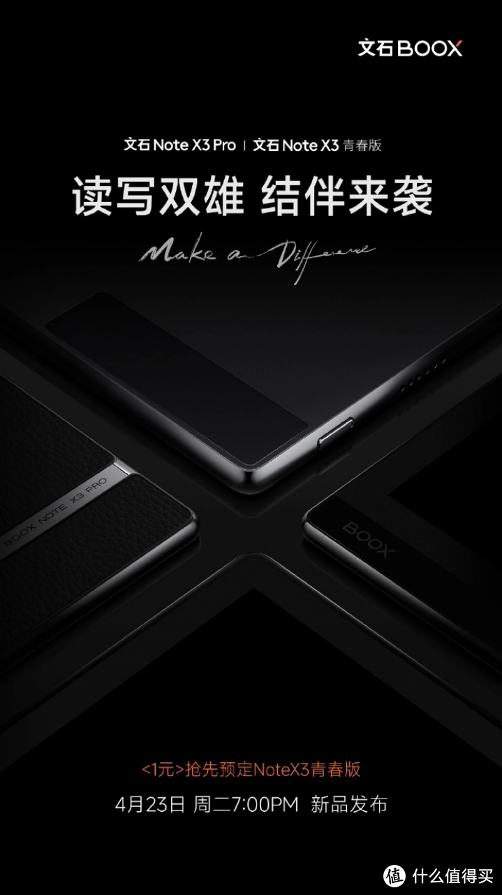 4 月 16 日快讯,科技巨头文石正式预告,其两款新品 Note X3 青春版与 Note X3 Pro 电纸书即将于 4 月 23 日晚 7 点正式发布。此次发布会的宣传语为“读写双雄,结伴来袭”,预示着这两款产品将在阅读和书写体验上带来重大突破。