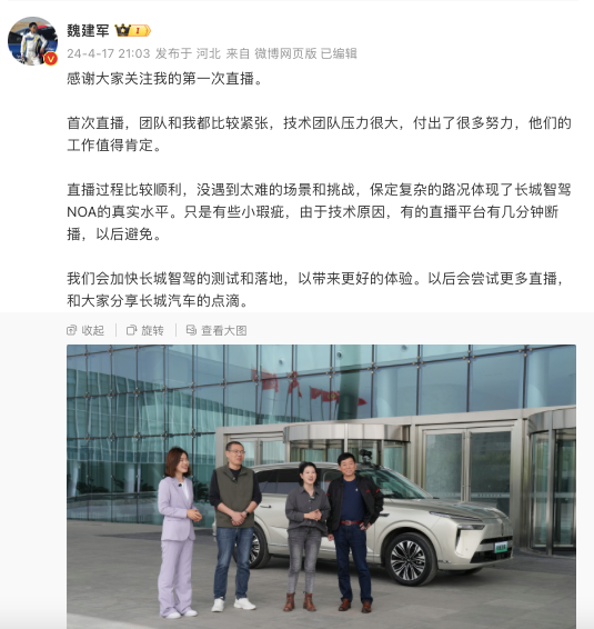 其中,长城汽车董事长魏建军最为“卖力”。在注册微博13年之后,他终于在3月26提(小米汽车发布会当天),发出第一条微博,并很快在微博又做了一次直播。