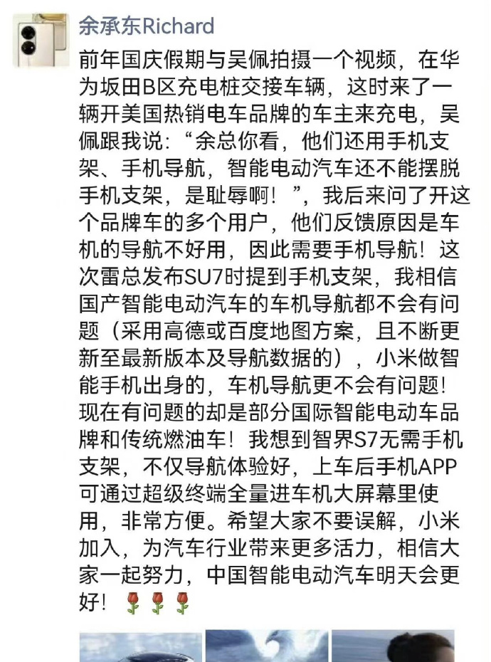举个例子。有关智能汽车里到底要不要放手机支架?这个话题由雷军而起,余承东接了过去在发布会调侃,随后,竟然难得“怂”了一回,发朋友圈解释。