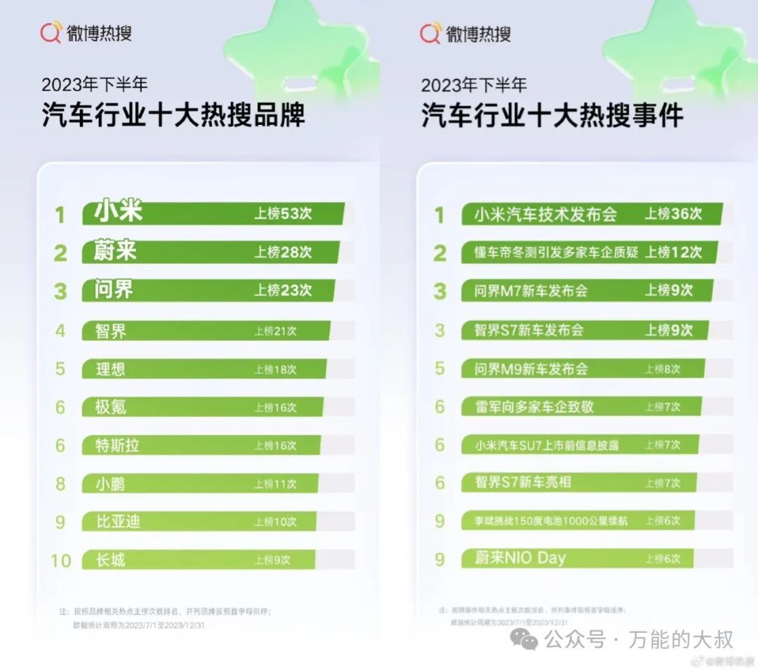 在微博上,2023年,与汽车相关的、阅读量过亿的话题,全年有455个,但相对都集中在了小米、蔚来、问界、智界和理想等几个汽车品牌中,头部效应明显。