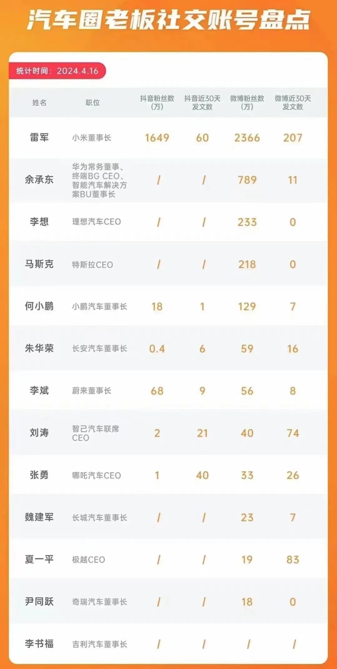 新榜最新公布的一组“车圈老板社交媒体账号盘点”数据,正好印证了这点。