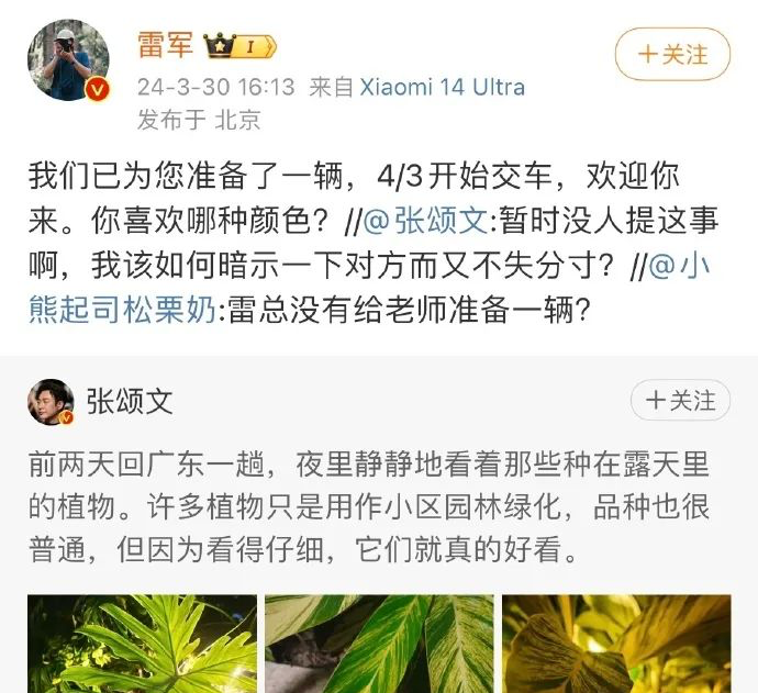 SU7上市前半个月,雷军平均每天发5条微博。SU7上市后,他微博更新频率更高,3月28日一天连发10条。此外,雷军还会和网友积极互动,或主动抛出话题,或在评论区回复网友提问,给人的感觉是,他几乎24小时泡在微博上。