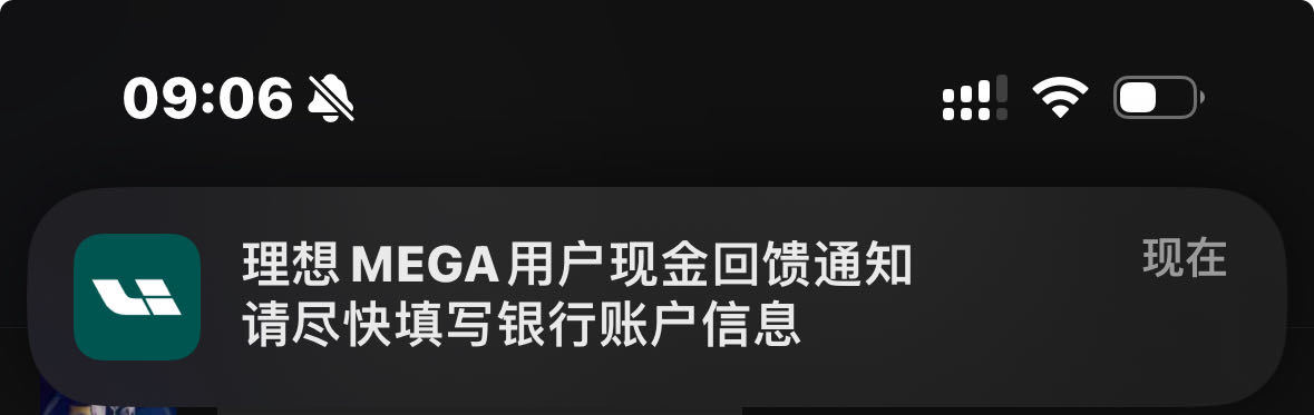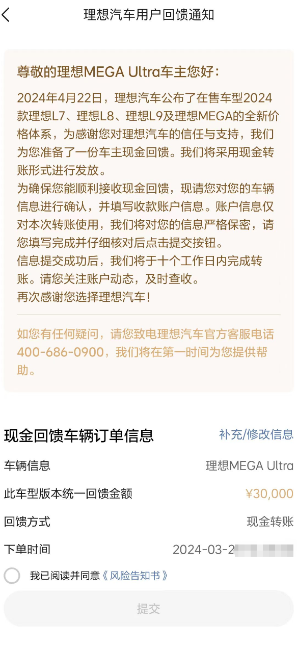 据理想MEGA车主向值得买测评网透露,已经收到理想App PUSH的现金回馈通知,需填写银行账户信息。