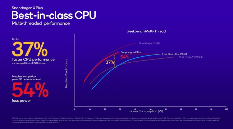 至于性能,高通还提供了许多测试对比,X Plus 在大多数测试中比 X Elite 慢了 8% – 18%,部分测试差距较大,其中 CB 2024 的多线程测试中差距来到了 38%。值得一提的是,X Elite 应该用的是最顶级型号(即X1E-84-100)。