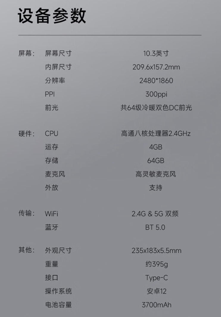 配置方面,搭载高通8核心2.4GHz处理器,拥有4+64GB存储,支持1TB OTG拓展,宣称无论是多任务还是办公应用都能游刃有余。采用一块10.3英寸的300PPI屏,同时Carta1200面板刷新速度更快,细节分明,用了再也回不去。