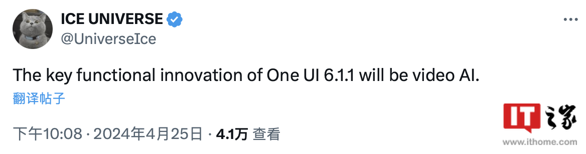 据 4 月 26 日最新媒体消息,据消息源“i 冰宇宙”透露,三星将在 OneUI 6.1.1 中推出一项“视频 AI”功能,不过他没有公布更多相关信息,参考现阶段各种“视频 AI”,预计相关功能允许用户通过描述词生成视频。