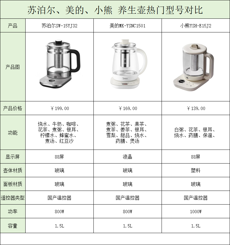 今天小编就给大家盘点了三款好用、大牌的养生壶产品,它们分别是苏泊尔SW-15YJ32、美的MK-YSNC1501、小熊YSH-E15J2.以下是这三款产品的具体参数: