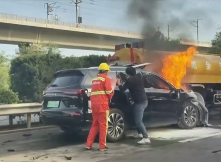 从事故视频来看,问界M7的隐藏式车把手并未弹出,有几人正在尝试砸车窗。