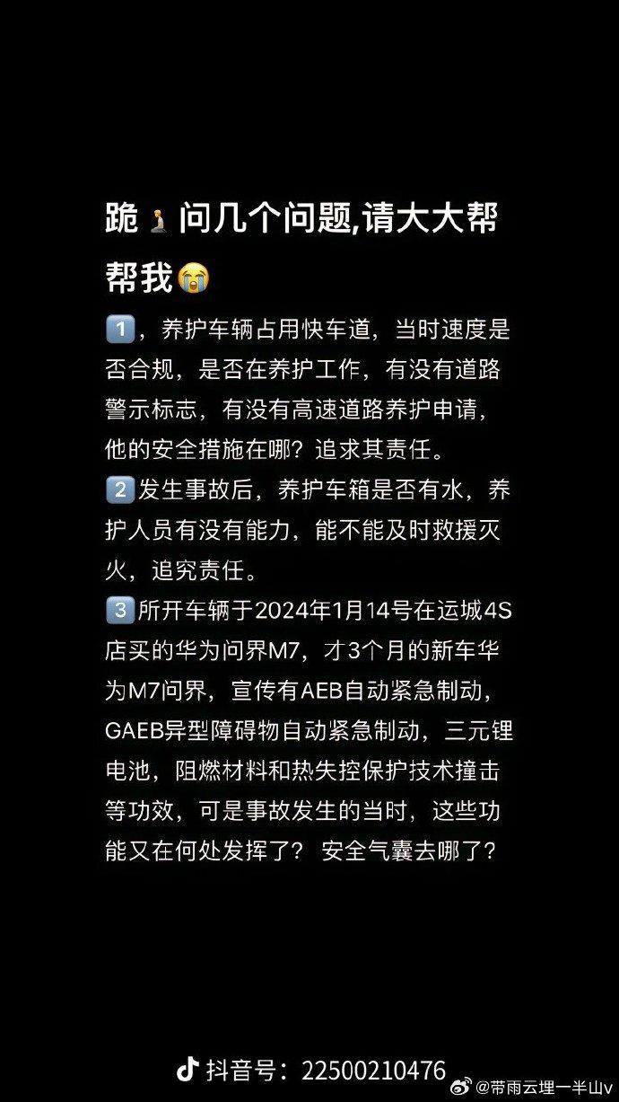 事故遇难者的妻子还提出了一系列疑问,包括养护车辆是否占用了快车道,当时是否有适当的道路警示标志,以及养护人员是否具备及时救援的能力等。此外,她质疑养护车辆的安全措施及其在事故中的责任。