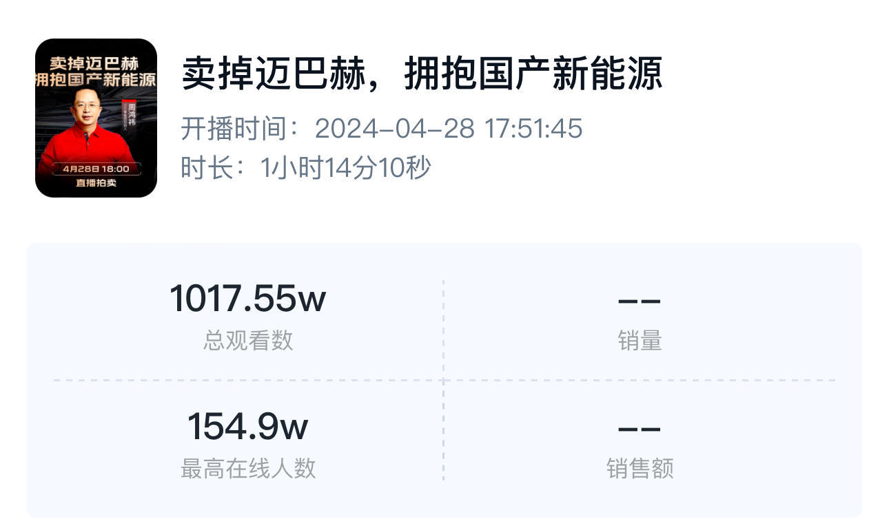 直播时长1小时14分,累计观看1017万,平均停留5分钟,累计增粉15万。