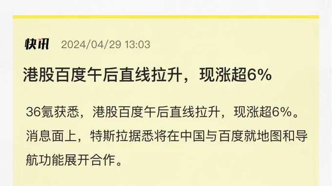 你看今天小鹏都积极的反应FSD的看法了,传言百度和特斯拉开展车道级的地图信息合作,百度的港股直接拉升7%。