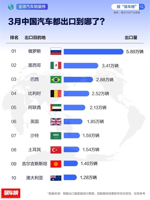 具体来看,中国汽车出口最多的国家为俄罗斯,3月份出口了5.89万辆;并且,中国汽车已开始逐步占领俄罗斯汽车销量榜的前十份额。