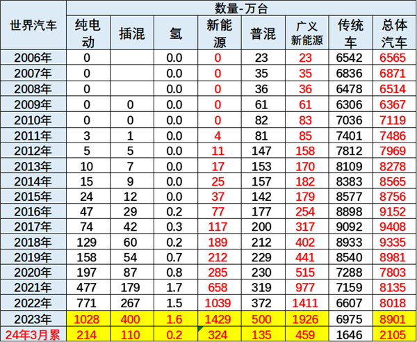 2024年1-3月份,世界汽车销量达到2105万台,其中新能源汽车达到324万台。