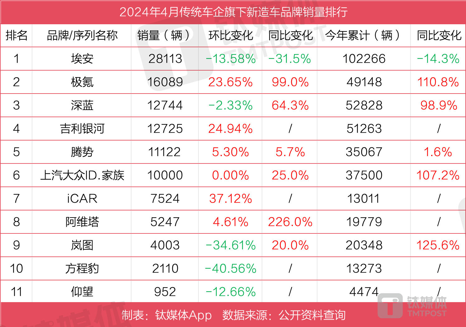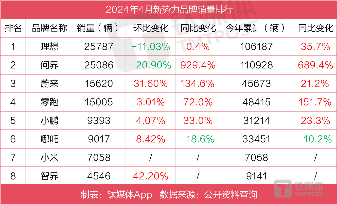 东风汽车旗下的岚图,作为最先跑出成绩的国家队高端新势力品牌,自2023年底交出超1万辆的历史最好月销成绩后,进入2024年后开始面临增长压力。其4月交付4003辆,环比下降35%,前4月累计交付2.03万辆,同比增长126%。