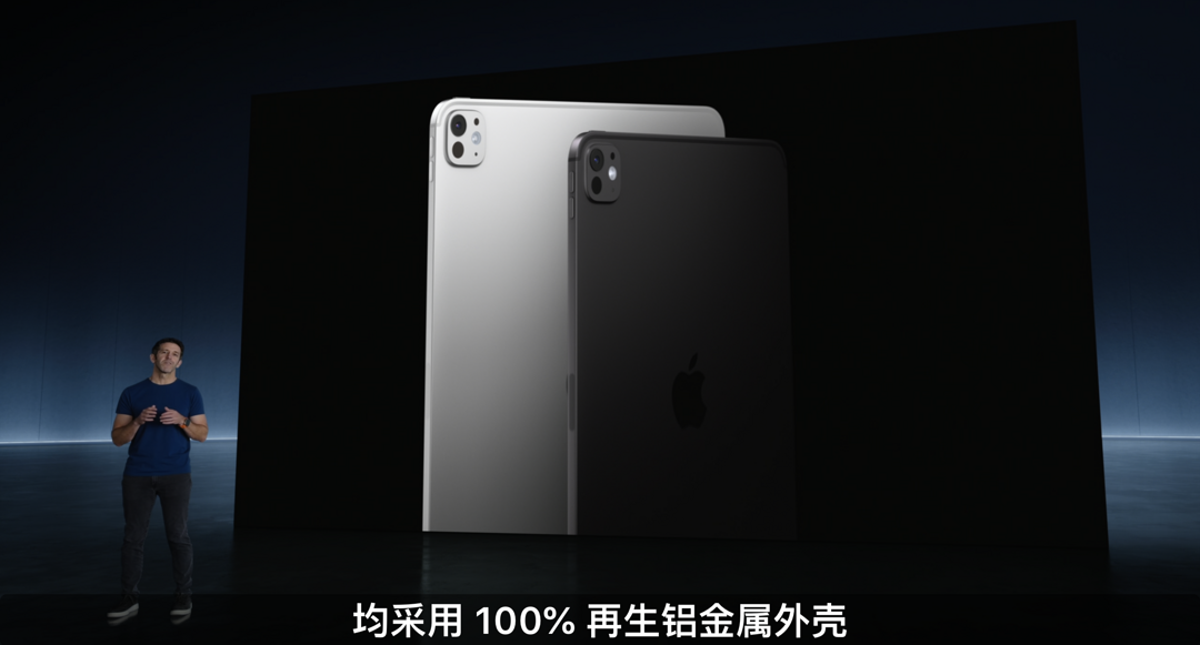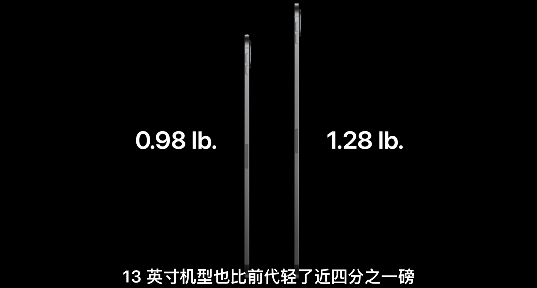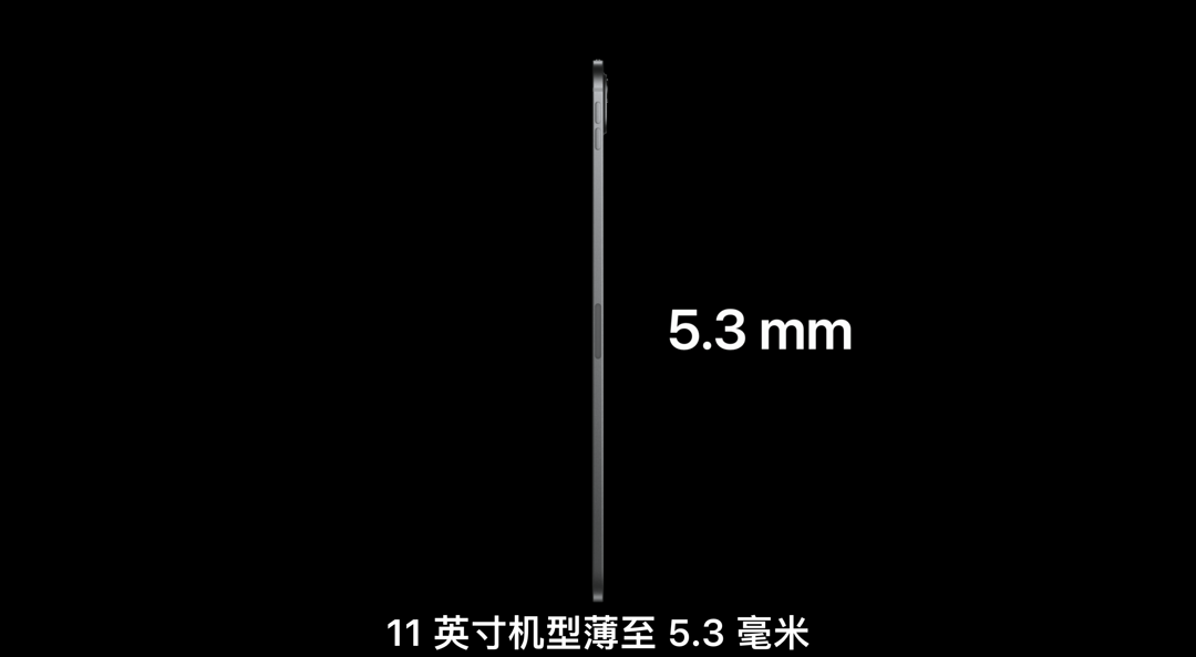 这次全新iPad Pro提供11英寸和13英寸两个尺寸,得益于用上OLED面板 厚度大大减薄,11英寸版厚5.3mm、13英寸厚5.1mm,成为迄今为止最薄的苹果产品。新iPad Pro 外壳均采用100%再生铝材质,同时提供银色和深空黑两款配色可选。