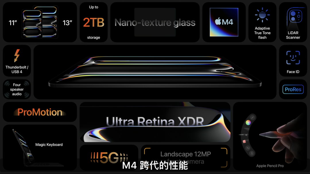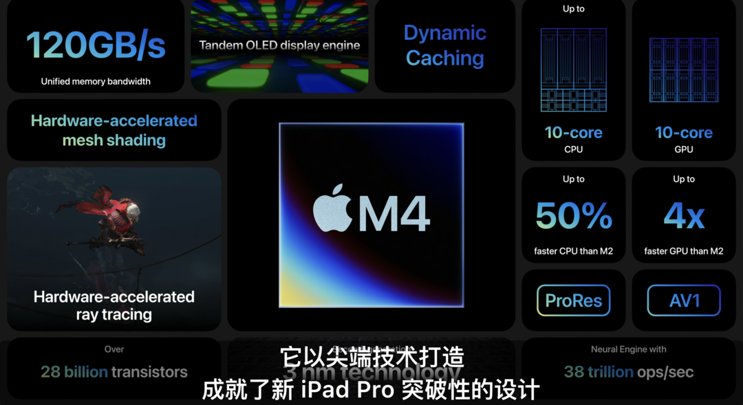 M4登场!全新一代iPad Pro直接首发M4芯片,基于第二代3nm工艺制程打造,搭载全新显示引擎,拥有10核CPU(4性能核心、6能效核心),宣称相比M2性能提升50%;集成10核GPU,相比M2速度提升4倍,支持光线追踪和网格着色;以及集成16核神经网络引擎,每秒可执行高达38万亿次运算。
