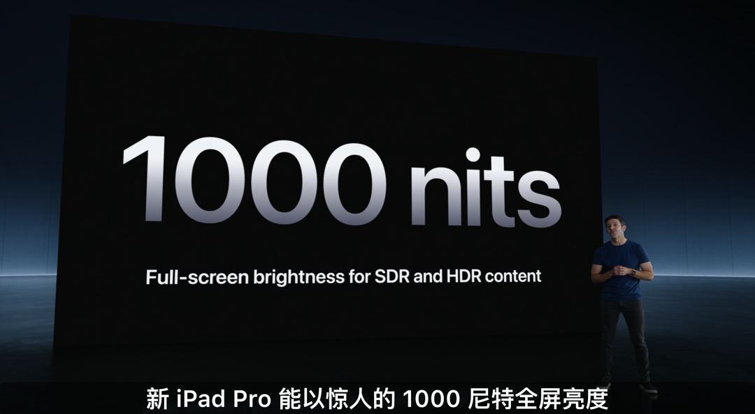 全新iPad Pro配备OLED面板,采用双层串联OLED结构,支持以1000nits全局最高亮度显示SDR和HDR内容,以及以1600nits局部激发亮度呈现HDR内容,宣称在暗部和暗光下的细节呈现胜过历代iPad。并且官方将这块屏幕命名为「Ultra Retina XDR」超精视网膜XDR显示屏 ,提供纳米纹理玻璃可选配。