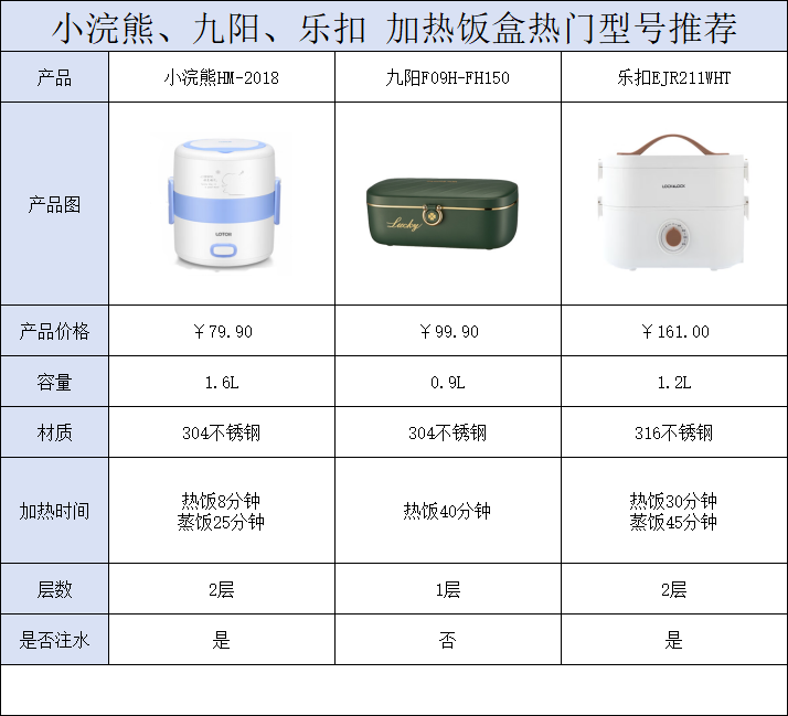 小浣熊HM-2018和乐扣EJR211WHT都是注水加热,这种款式饭盒不容易糊锅;