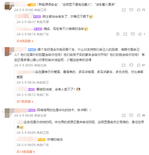 有人称“为什么起火,责任全在美方”、“阿维塔用的也是华为的技术,快冲啊”、“肯定是电池着火了,要不然也不会烧得这么旺。”