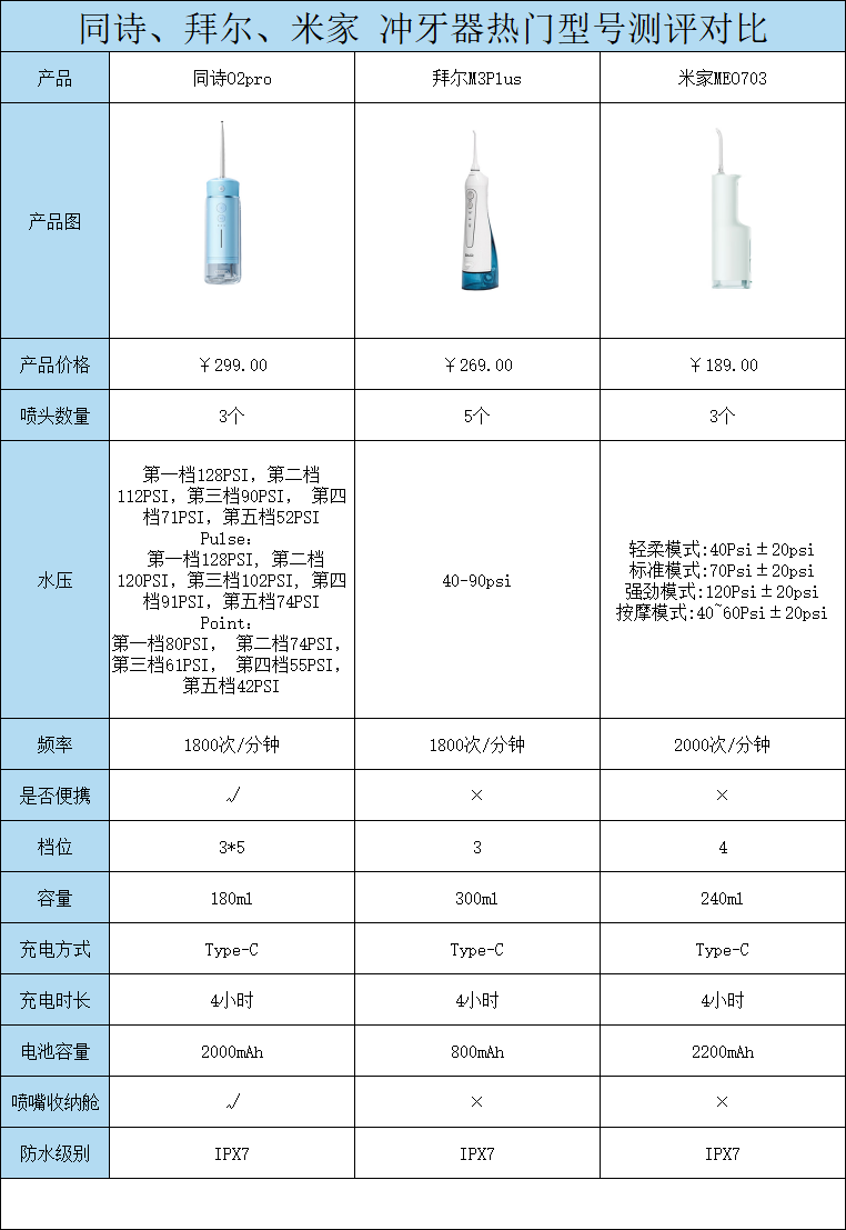 今天小编就给大家盘点了几款热门、好用的冲牙器产品,它们分别是同诗O2pro、拜尔M3Plus、米家MEO703.以下是这三款产品的具体参数: