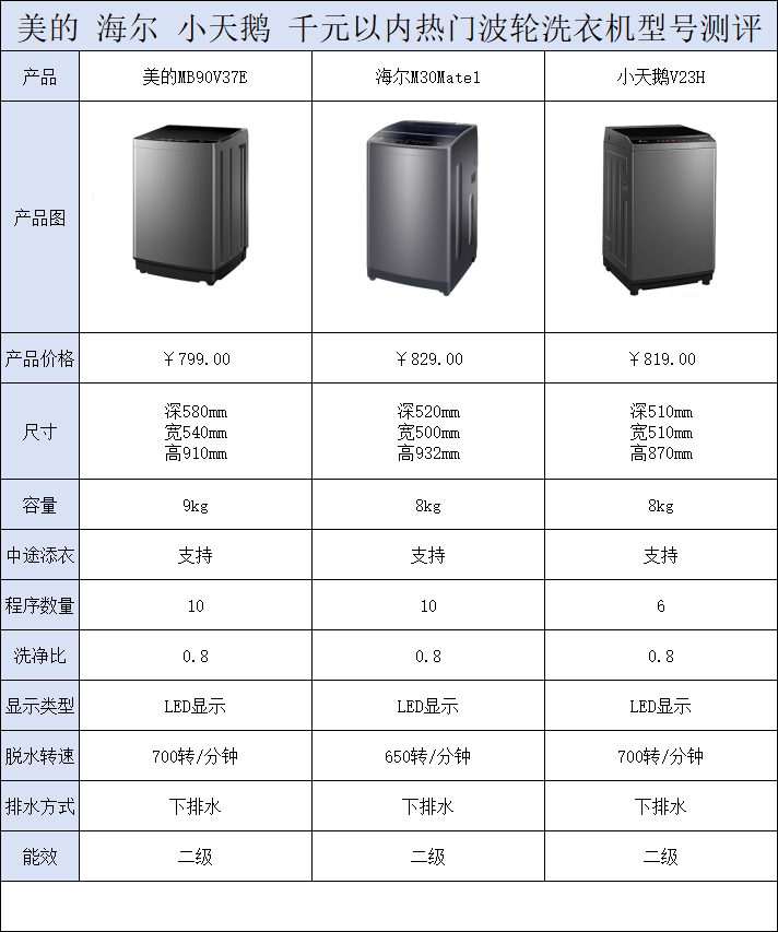 洗衣机是我们一年四季中都会使用到的一款家电,它可以让我们更方便、更省时,是我们家庭生活中的好帮手之一。 今天小编就给大家盘点了几款千元以内的波轮洗衣机产品,它们分别是美的MB90V37E、海尔M30Mate1、小天鹅V23H,以下是这几款产品的具体参数: