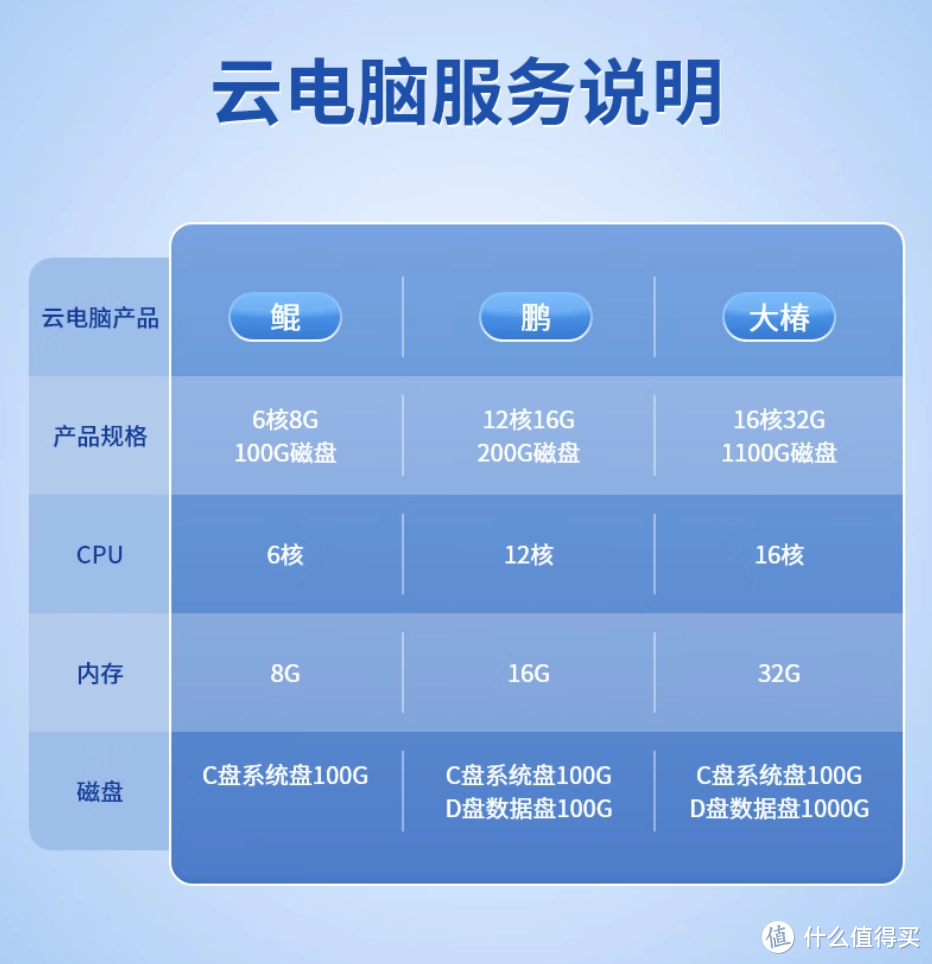 为了满足不同用户的需求,“逍遥”系列提供了“鲲”、“鹏”和“大椿”三种云电脑服务选项,分别对应不同的CPU、内存及磁盘规格。其中,最基础的“鲲”版本售价为 1899 元,而最高配置的“大椿”版本售价为 4999 元。