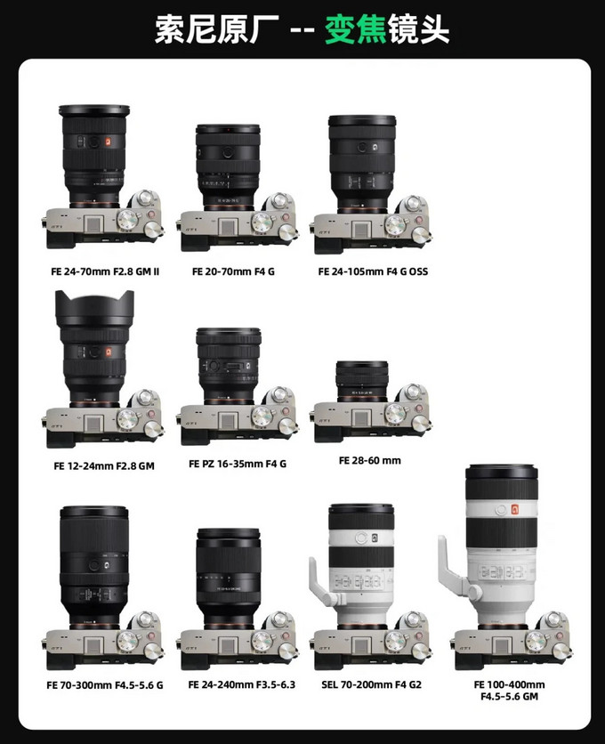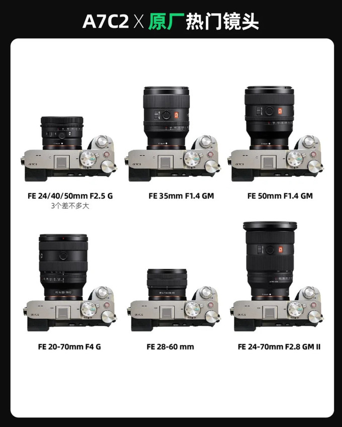 2. FE 24-50mm f/2.8 G:重量为440g,覆盖24、35、50mm三个常用焦段,F2.8光圈有利于低光拍摄和创造浅景深效果,适合作为挂机镜头,尤其适合视频拍摄。