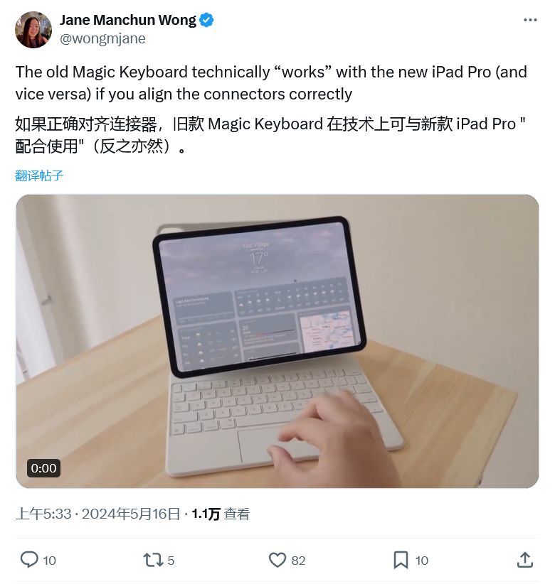 Wong 还表示新版妙控键盘也可以兼容旧款 iPad Pro,苹果官方并未通过软件的方式禁用这种配对行为。