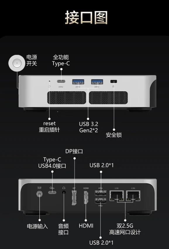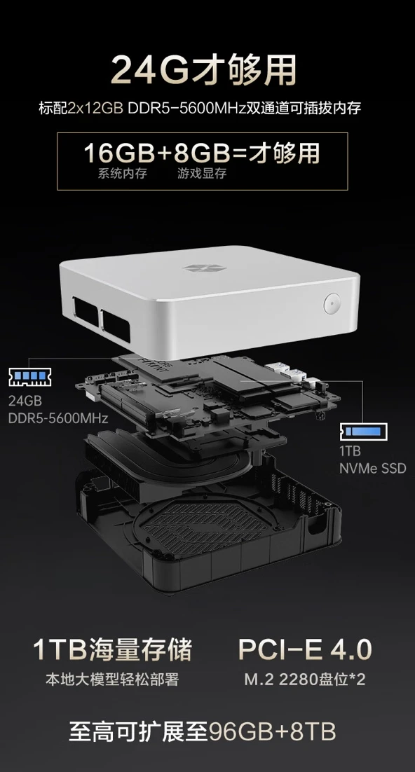 新款迷你主机采用,采用8核心16线程的AMD锐龙7 8845H处理器,并内置780M核心显卡,2个M.2硬盘位,2个2.5G网口,无线网卡还不是叠叠乐,65W性能释放,拳打脚踢自家酷睿兄弟。
