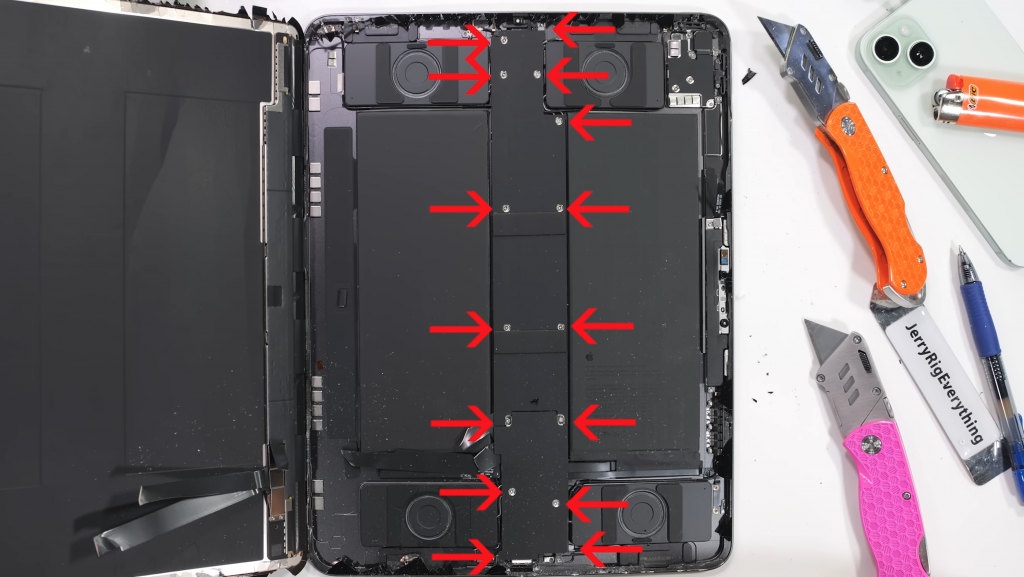从 JerryRigEverything 视频中的拆解来看,确实能看到在 iPad Pro 内部,有一条金属盖横跨了整台 iPad。