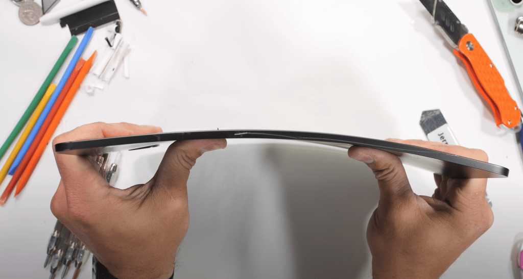 ▲ JerryRigEverything 的 iPad Pro 开箱就带有一丝丝弯折