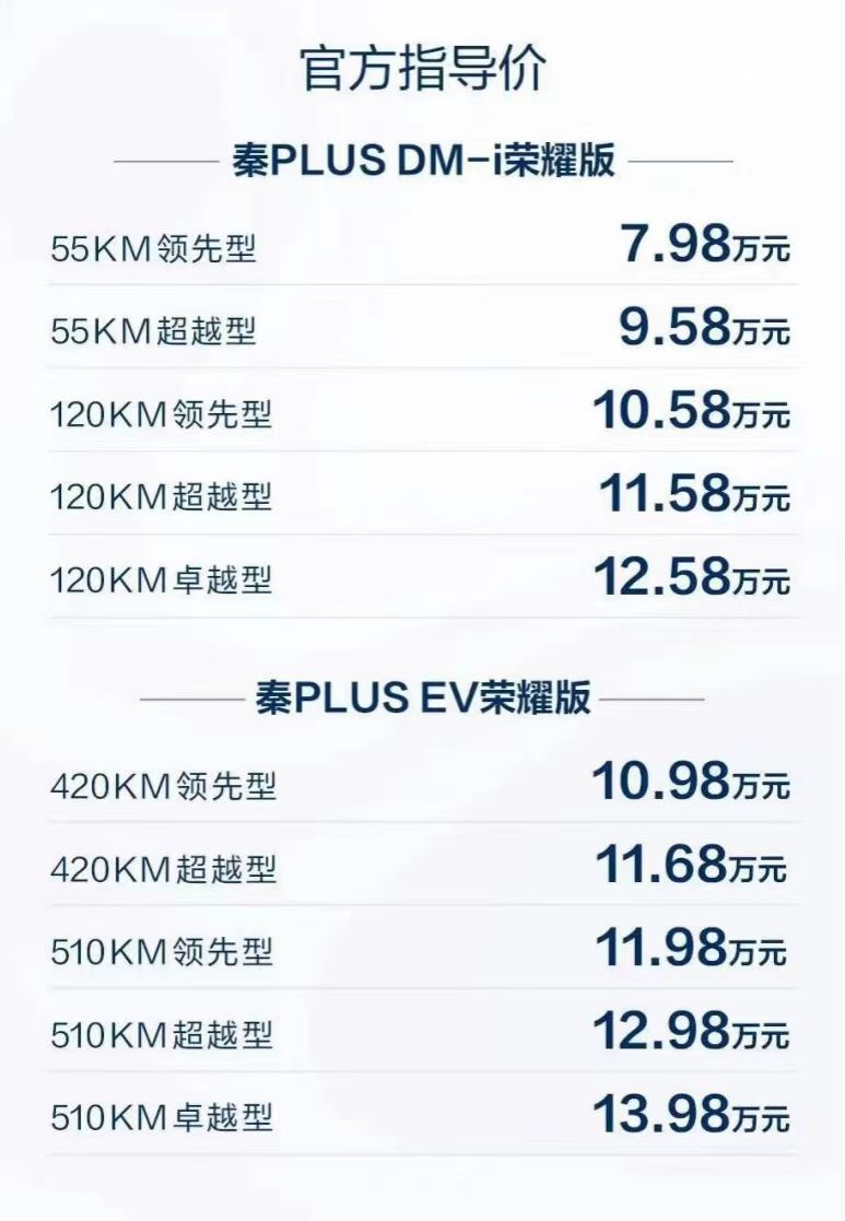 所以从2月份喊出“电比油低”的口号后,不到一个月的时间,比亚迪已有8款荣耀版车型上市,分别是秦PLUS、驱逐舰05、海豚、汉、唐、宋PLUS、海豹和宋Pro,平均直降2万元,且配置有升级。