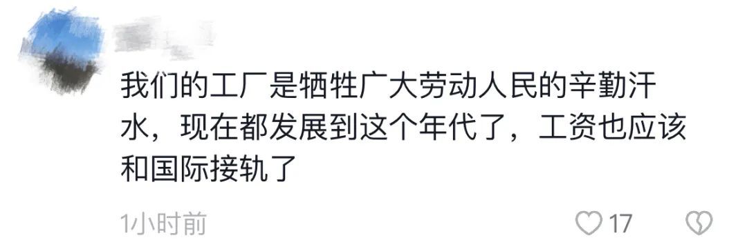 我们的工厂是牺牲广大劳动人民的辛勤汗水,现在都发展到这个年代了,工资也应该和国际接轨了。