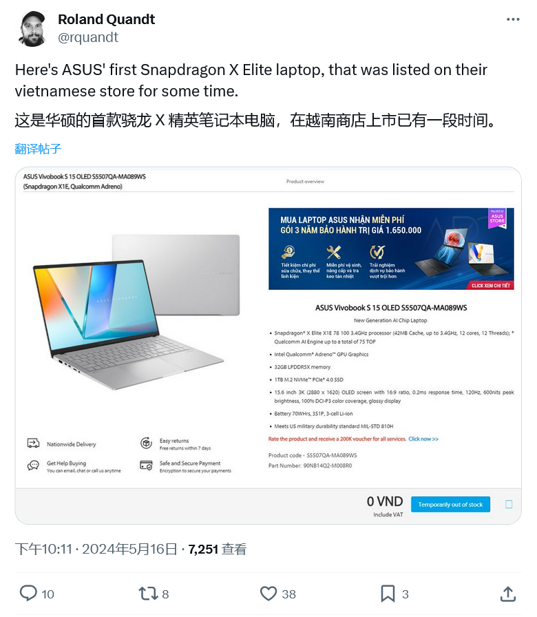 据消息华硕将会在接下来推出全新的AI轻薄本,首发骁龙X Elite处理器。目前搭载骁龙 X Elite的新机现已出现在越南官网,Roland Quandt网友发现,不过目前链接已下架。