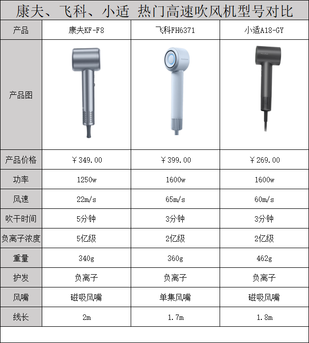 现在市面上的吹风机五花八门的,选来选去都不知道哪款好,选错了不仅浪费钱,还容易伤头发。今天小编就给大家推荐了几款较新、较热门的高速吹风机,这几款吹风机均价都在400元以内!好评度、销量都非常高!它们分别是康夫KF-F8、飞科FH6371、小适A18-GY。以下是这三款产品的具体参数: