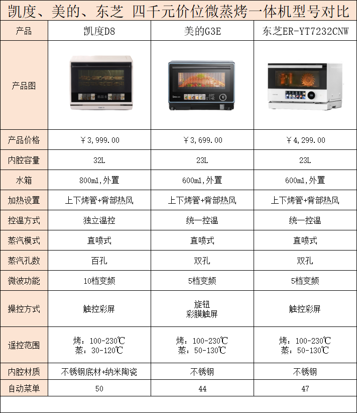 美的G3E(3699)>凯度D8(3999)>东芝ER-YT7232CNW(4299)。以上三款产品中,价格最低的是美的G3E,价格较高的是东芝ER-YT7232CNW。而从容量、内胆、蒸烤等功能来看,表现较为出色的是凯度D8.所以想要购买性价比高一些的,推荐凯度D8.