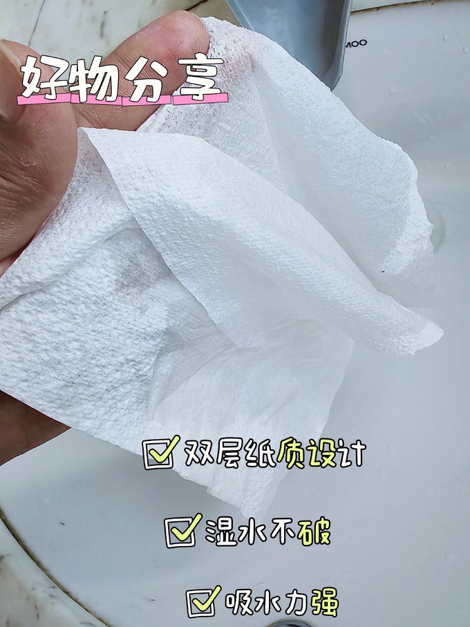 4、采用的是双层纸质设计,增强了纸张的耐用度,很厚实,而且吸水力强,不会轻易破损,一张即干!非常适合擦拭手上的水渍和厨房的油污。