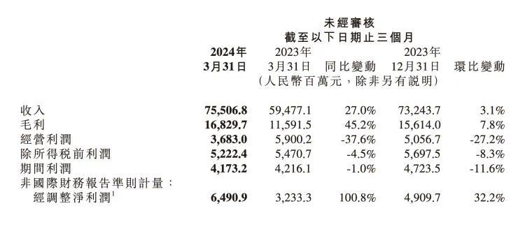主要原因在于,小米SU7在3月下旬上市,对小米的财务贡献,要到下一季度的财报才能有所涉及。