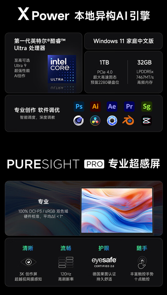 屏幕方面,配备一块14.5英寸3K 120Hz IPS创作屏,覆盖100% DCI-P3 色域,通过DCI-P3与sRGB双色域硬件校准,支持十点触控,并获得德国莱茵认证。