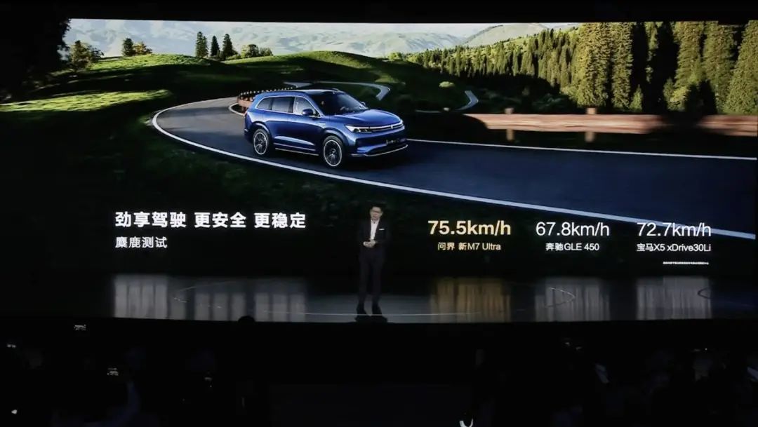 问界新 M7 Ultra 更高的操稳性,成功将麋鹿成绩提高至 75.5km/h。作为对比,尺寸相近的奔驰 GLE 450 为 67.8km/h,宝马 X5 xDrive30Li 为 72.7km/h。