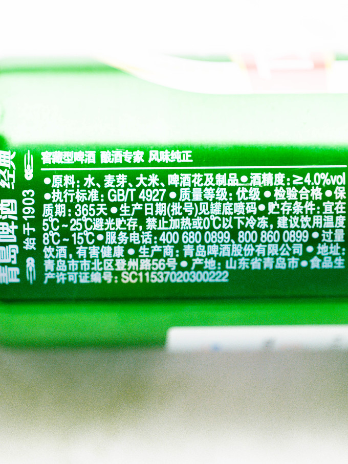 它的原料只有水、麦芽、大米、啤酒花,酒精度≥4.0%vol,小酌怡情,一罐550ml刚刚好~淄博最正宗的烧烤,就要搭配青岛啤酒!