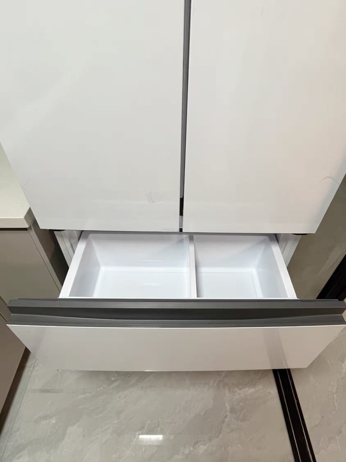 实际使用中,那个双层直开的大抽屉很好用,抽屉比较宽敞,存放大块食物都很方便。抽屉导轨质量也好,承重能力强,滑动轻松静音。