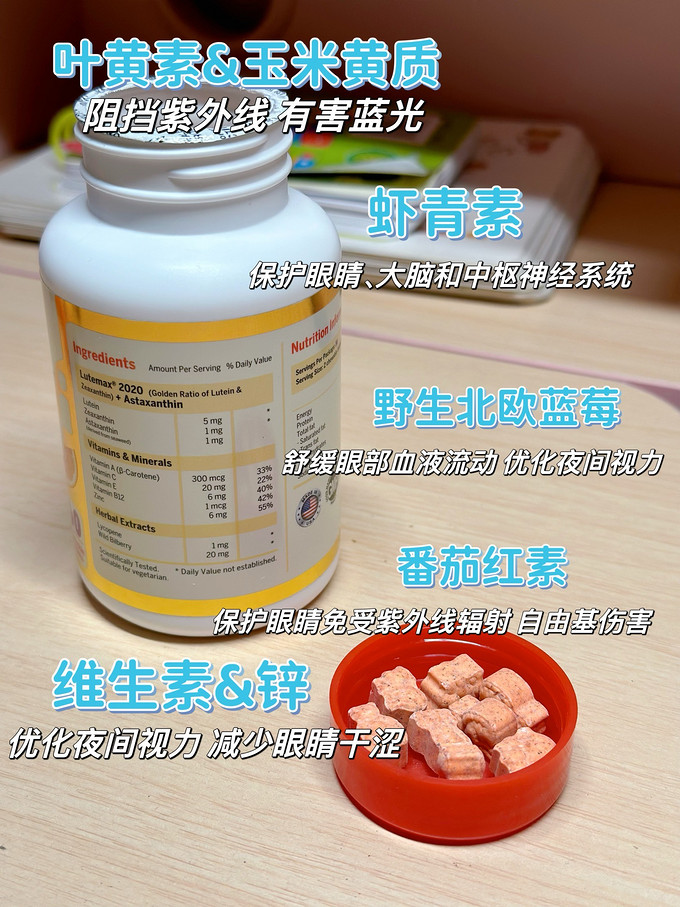 10种复合护眼配方,可谓是眼部“十全大补”对于平时孩子用眼疲劳、电子蓝光辐射,都有明显改善作用;从非洲万寿菊中提取的叶黄素、玉米黄质、玉米黄质异构体,原料好,效果佳。同时严格遵守美国国立眼科研究中心(NEI)叶黄素和玉米黄质5:1的黄金配比,是国际公认的最佳比例!除此之外,还特别添加了虾青素,帮助预防蓝光引起的视网膜损伤,比市面上其他常规单一营养成分产品更全面!