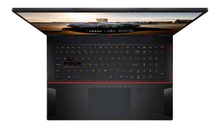 外观方面,A面有醒目的微星+奔驰AMG的背光LOGO,C面掌托区域有大面积类碳纤维设计,屏幕下方发音孔还有 AMG 镂空设计,键盘下方红色饰条点缀,所有按键都支持单键背光自定义,总体而言很有辨识度。
